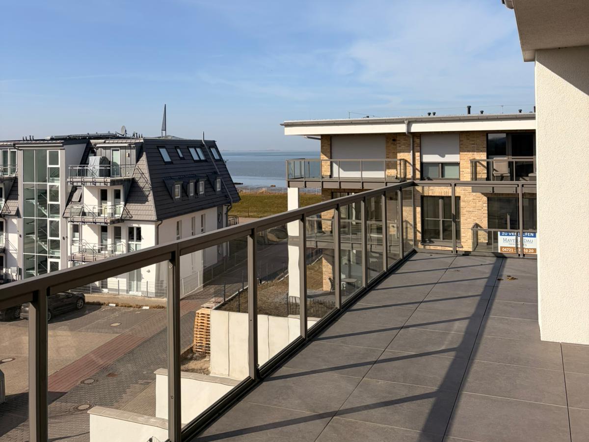 Riesige Dachterrasse mit Blick auf Neuwerk (im Nordwesten) und in die Weiten des Grünlandes (im Südwesten), ausgestattet u.a. mit einer Essecke und ...