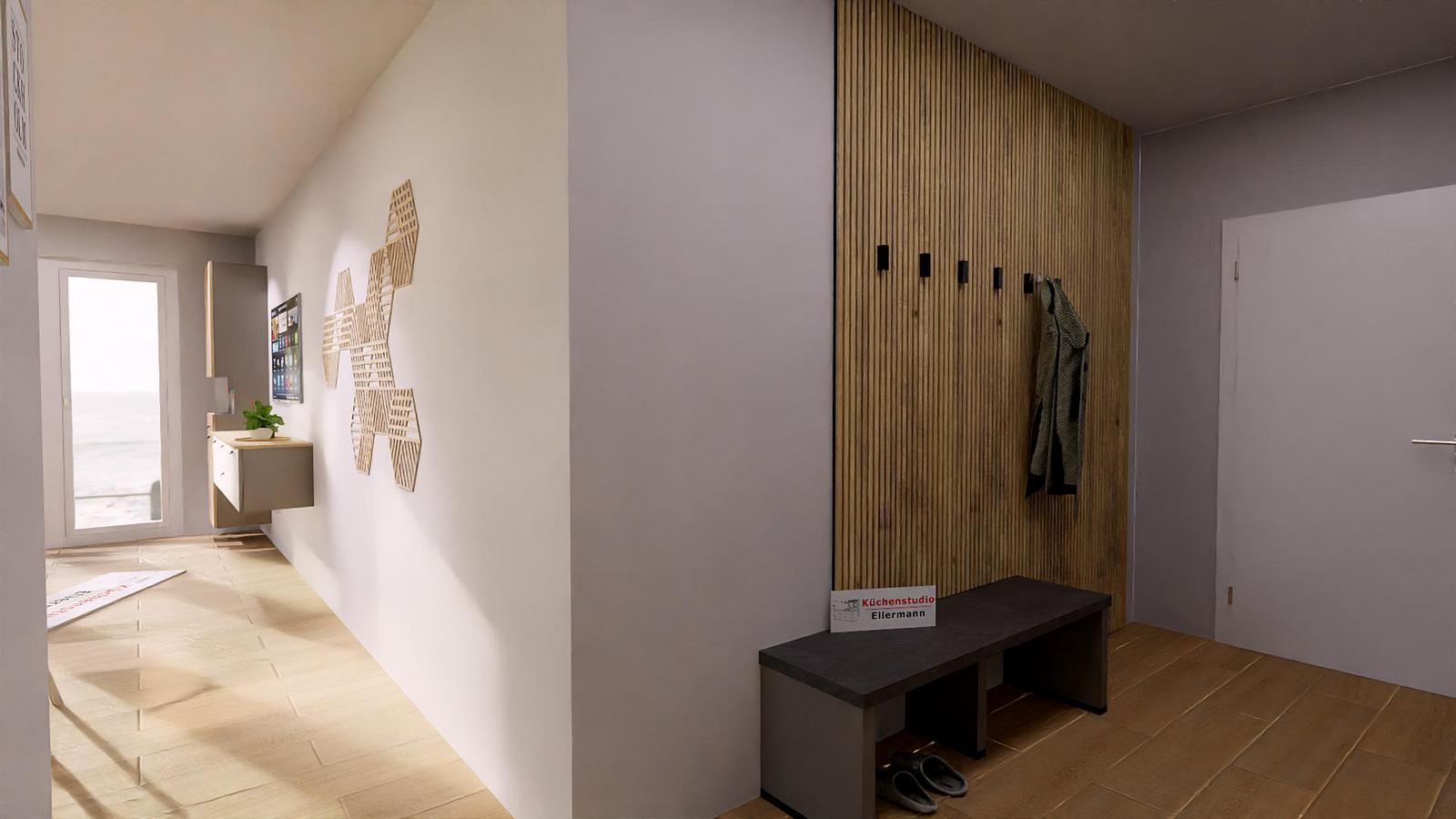 Im Flur haben wir wie bei der großen Schwester - steenloper.de - auch eine Bank vorgesehen, damit Sie in Ruhe Ihre Stiefel oder Schuhe ausziehen können.
