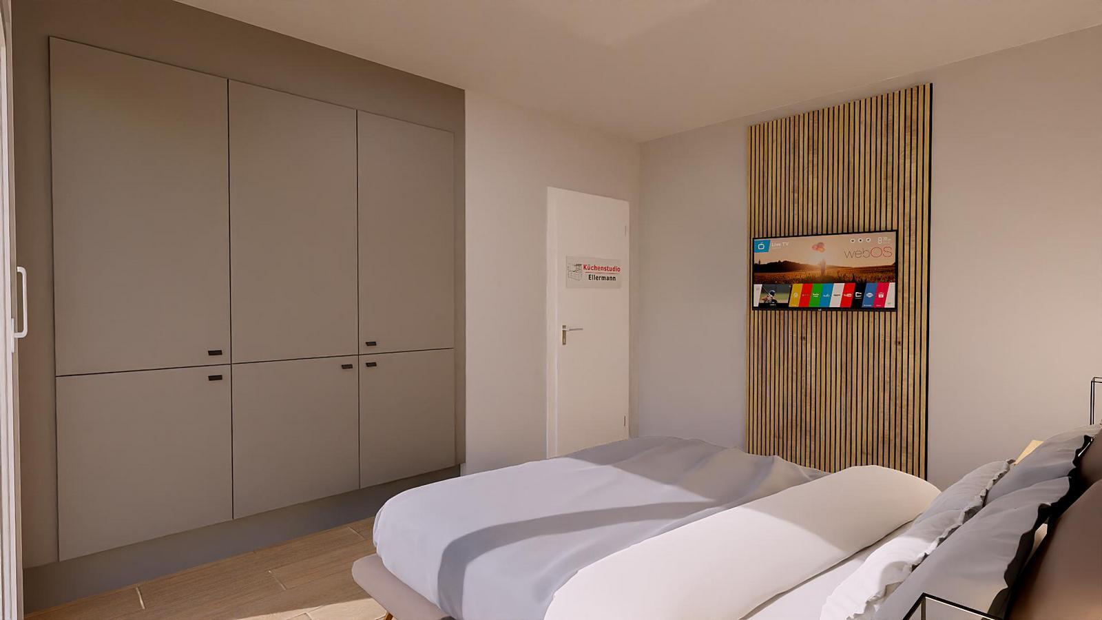 Im Schlafzimmer (12qm) erwartet Sie ein breites durchgängiges Boxspringbett (180*200), ein geräumiger Kleiderschrank und ein schwenkbarer 4K-Fernseher.