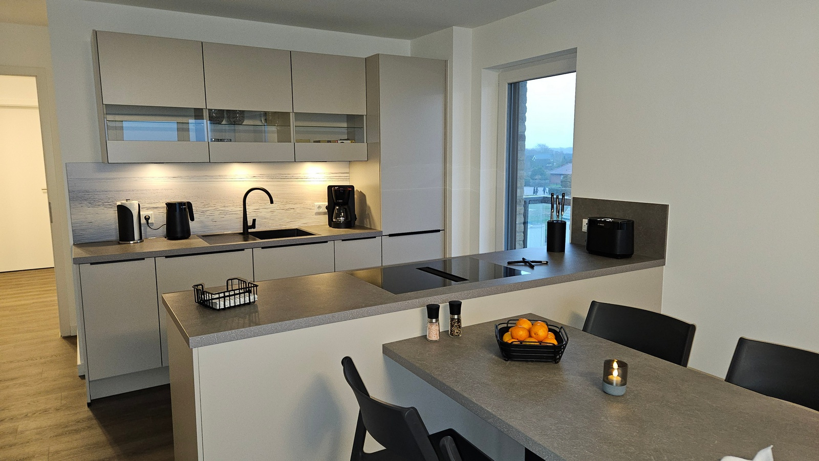 Kühlschrank (mit kleinem Gefrierteil), Backofen mit intergrierter Mikrowelle und Spülmaschine sind ebenso vorhanden wie der Induktionsherd mit Abzug - selbst beim Kochen haben Sie Blick durch die Häuser auf die Insel Neuwerk!